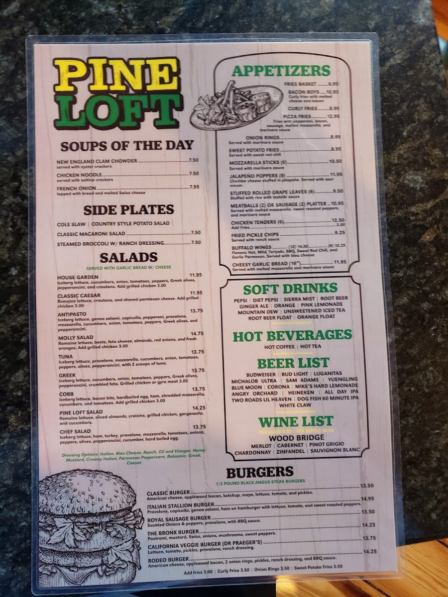 Welcome to Pineloft Restaurant, a charming eatery nestled in the heart of Berlin, Connecticut. Renowned for its cozy, log cabin ambiance, this culinary gem offers a diverse menu that caters to all palates. From classic appetizers like crispy buffalo wings and mozzarella sticks to delectable pizzas featuring unique toppings, such as the savory "Tuscany" with spinach and sun-dried tomatoes, each dish is crafted with care.